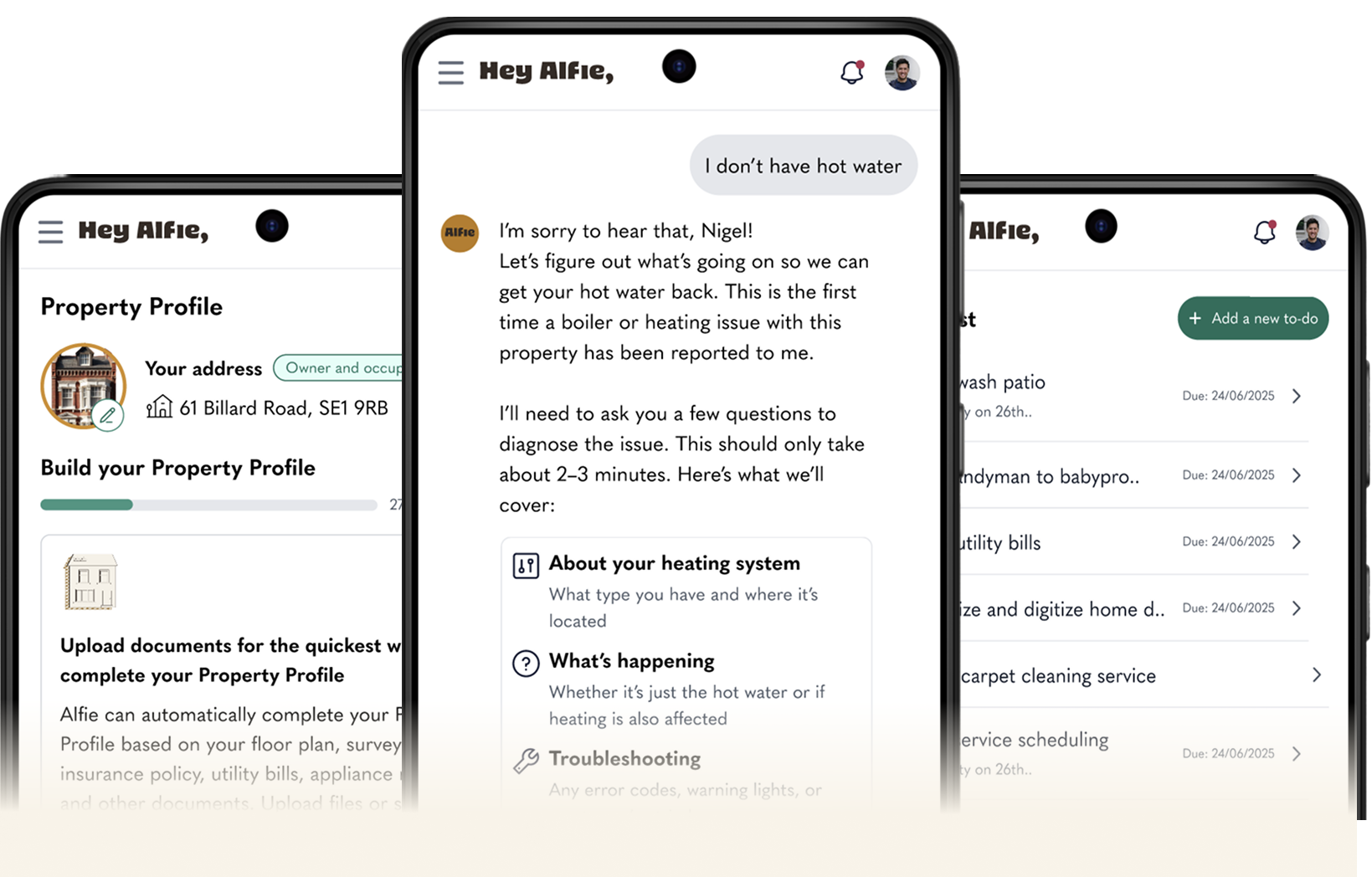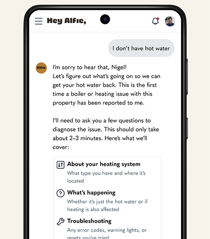 Hey Alfie is not a directory or marketplace. It’s your personal AI property manager. Alfie is here to help you diagnose problems, source trusted pros, manage bookings, and following up to ensure the work meets high standards. Alfie also helps you with your DIY fix!